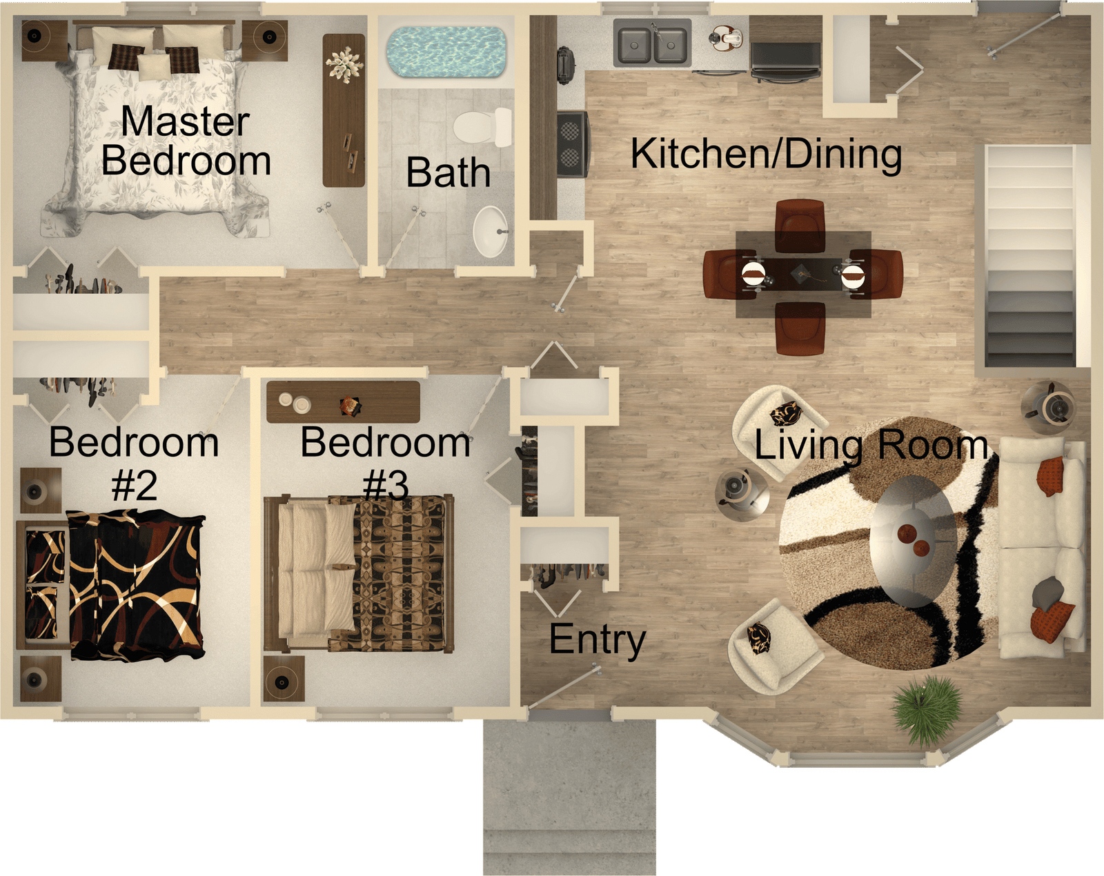 The Harbor Light House Kit offers 1,054 sq ft of thoughtfully designed space, featuring 3 bedrooms and 1 bathroom. The spacious, bright living room with bay windows creates an inviting ambiance, while the convenient rear entry provides direct access to the kitchen or basement. This versatile layout is perfect for families or those seeking functional elegance.