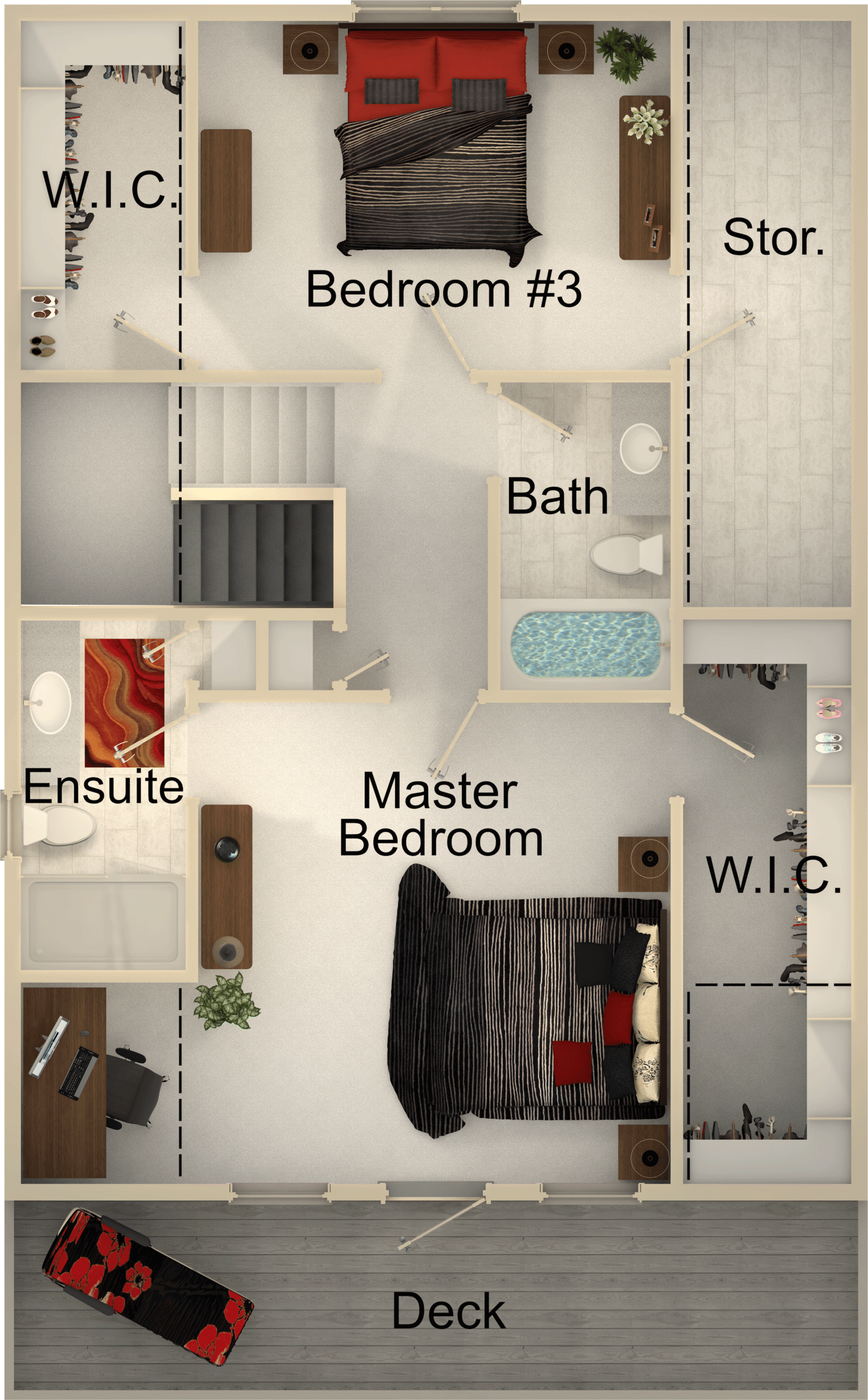 • Master Bedroom: 14′-4″ x 14′-6″